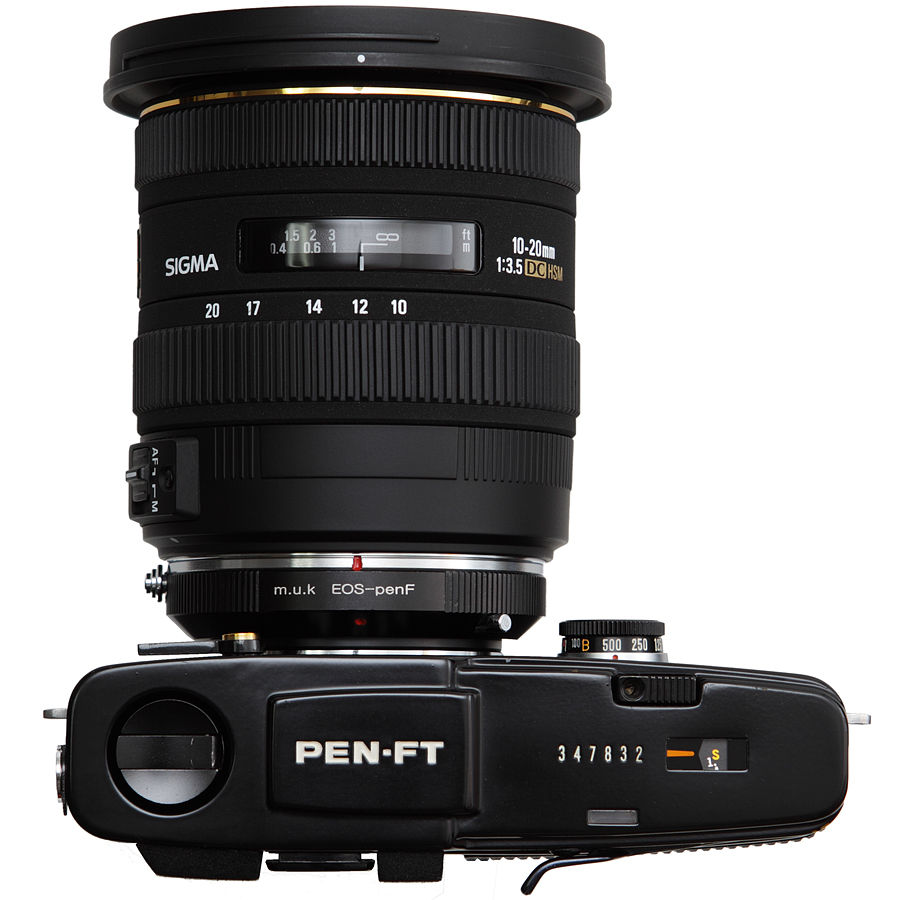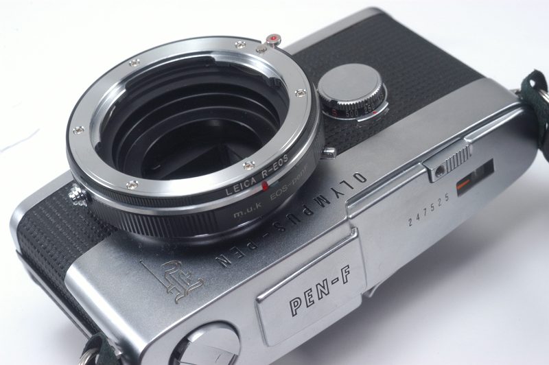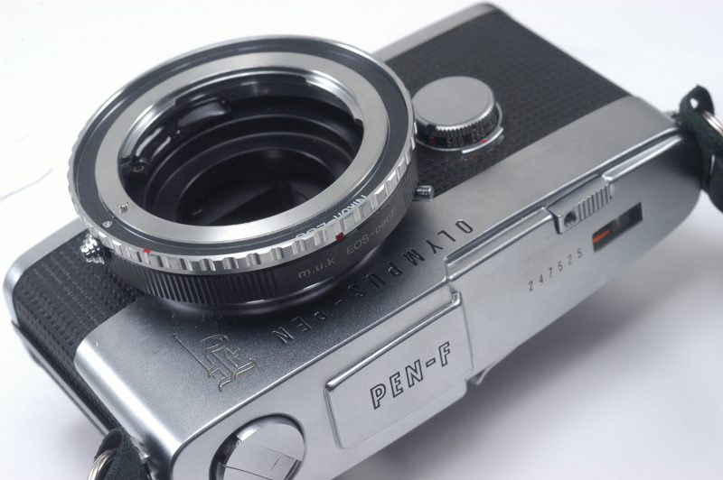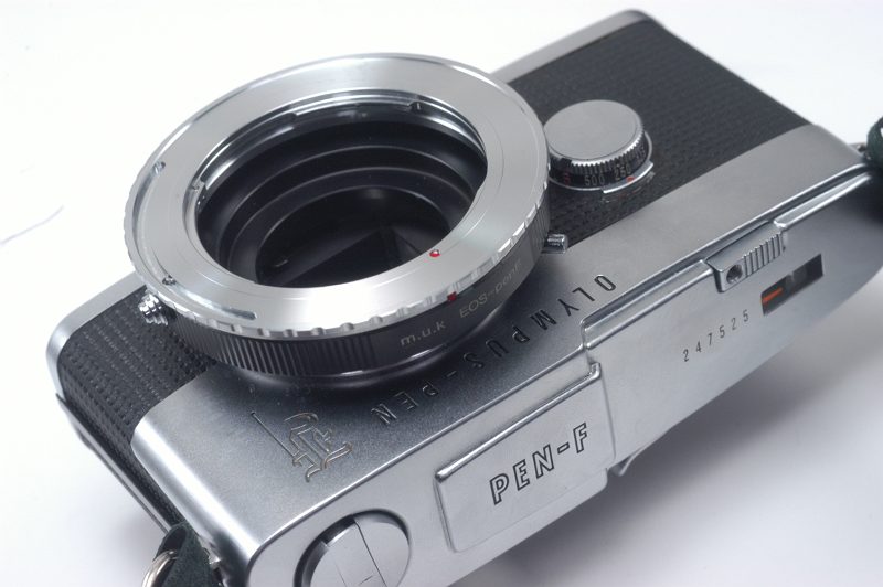 ハーフ、一眼の銘機ペンFのボディにEOS用アダプタをセットして、