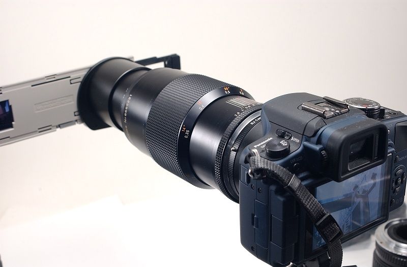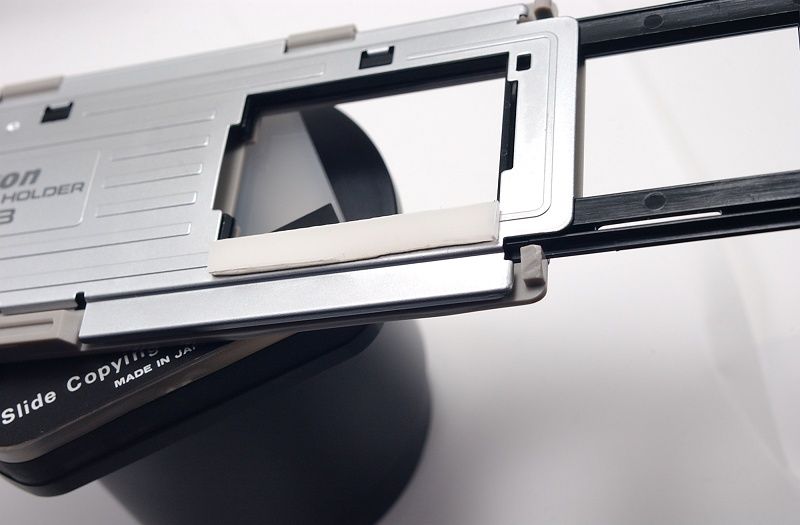 スライドコピーアダプタ ES-1はマクロレンズと組み合わせる簡易デュープ装置です。しかしスライドマウントを挟むように作ってあるためスリーブを扱うには少々厄介でした。