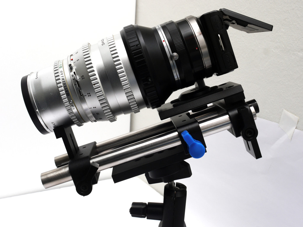 レンズセンターに三脚穴が無いカメラはマクロスライダーなどで調整する必要があります。