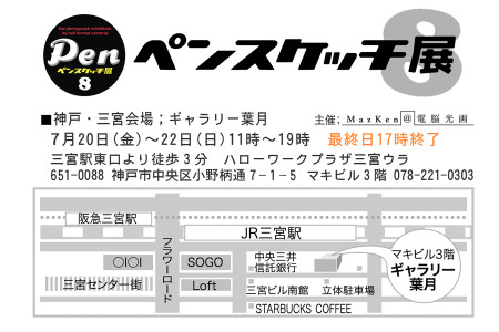 イベント・告知 2012年07月01日 ペンスケッチ展8 神戸・三宮 ギャラリー葉月 7月20日(金)から22日(日) 私も出展します 開催日;7月20日(金)-- 22日(日) 開場;11時 -- 19時 (最終日17時まで入場可・20時撤収完了) 開催地;[ギャラリー葉月] * 3階になります 〒651-0088 神戸市中央区小野柄通7-1-5 マキビル 3F Googleマップ http://goo.gl/maps/MS30 是非見に来て下さい。 muk 小菅宗信 カテゴリの最新記事 前の記事: オリンパスOMマウントのレンズ フジXマウント用マウントアダプター 次の記事: お宝拝借シリーズ!Nikon1編−お客様からお借りしたレンズです。