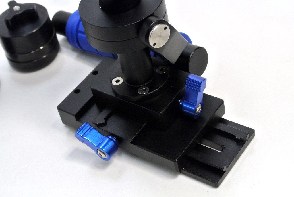 カメラの重心のバランスは、固定台のクロスレールを前後左右に調整しロッドが真っ直ぐになるよう調整します。