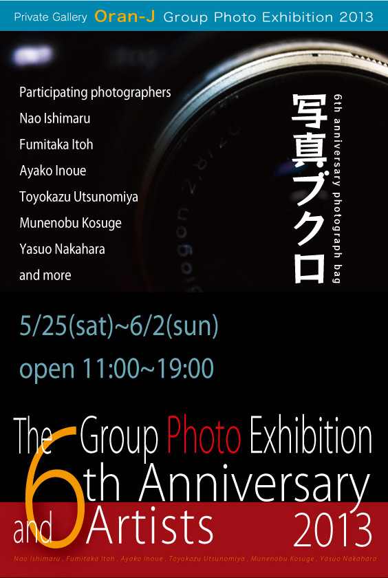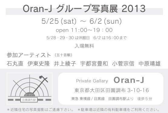 イベント・告知 2013年05月10日 Oran-J グループ写真展 2013年 5月25日(土)〜6月2日(日) Oran-Jグループ写真展2013 今年も参加いたします。 どうぞよろしくお願いします 期間:2013年5月25日(土)〜6月2日(日) 時間:11:00〜19:00(最終日16:00まで) 休館日:5/28(火)、29(水)、30(木) 場所:「 Private Gallary Oran-J 」東京都大田区田園調布3-10-16 東急 東横線 / 目黒線 田園調布駅より 徒歩5分 ありがとう御座いました。 muk 小菅宗信 カテゴリの最新記事 前の記事: NikonFマウント改造フランジ 3種 OM ・Y/C ・LeicaR 次の記事: 日本カメラ6月号にmuk selectのマウントアダプタの紹介をして頂きました