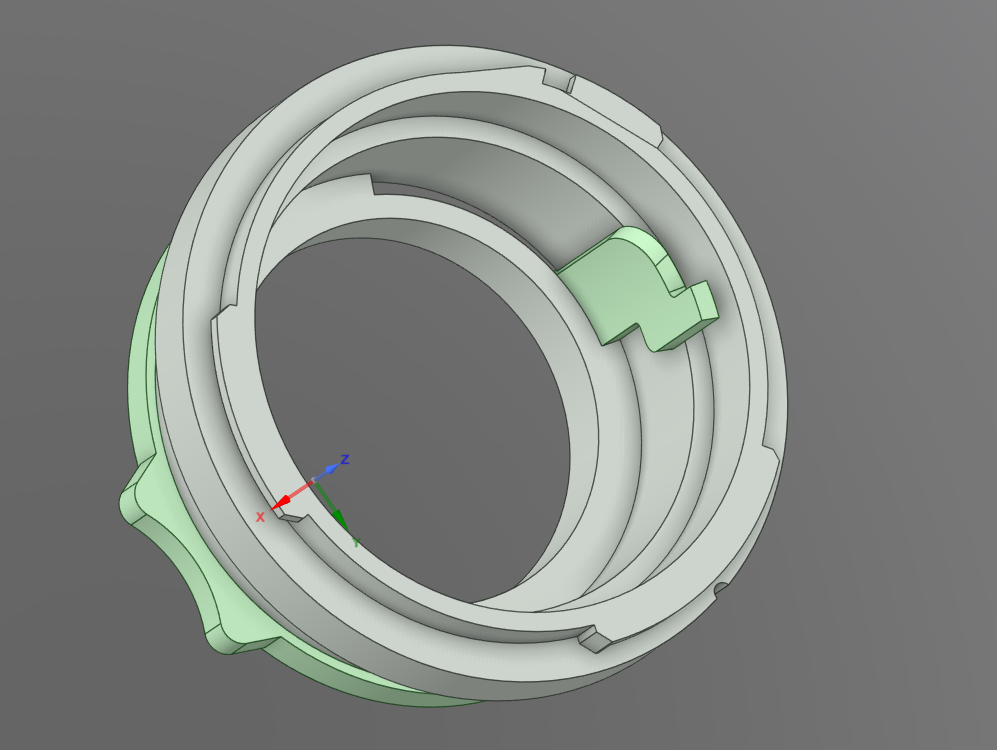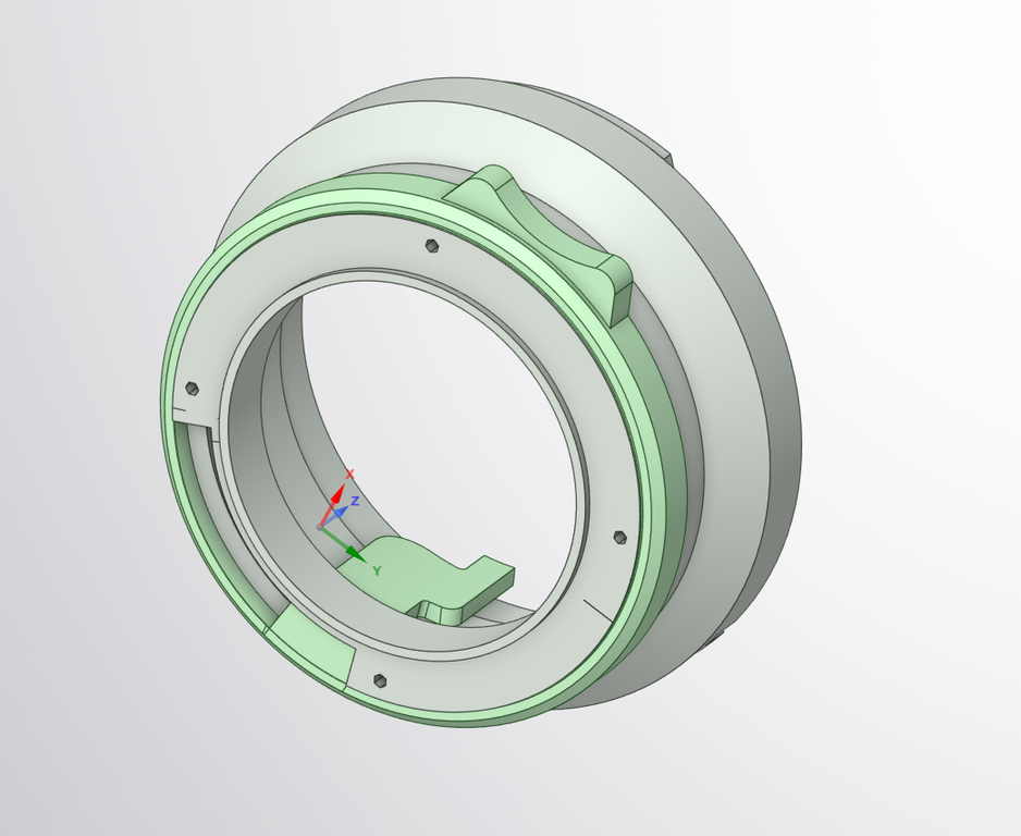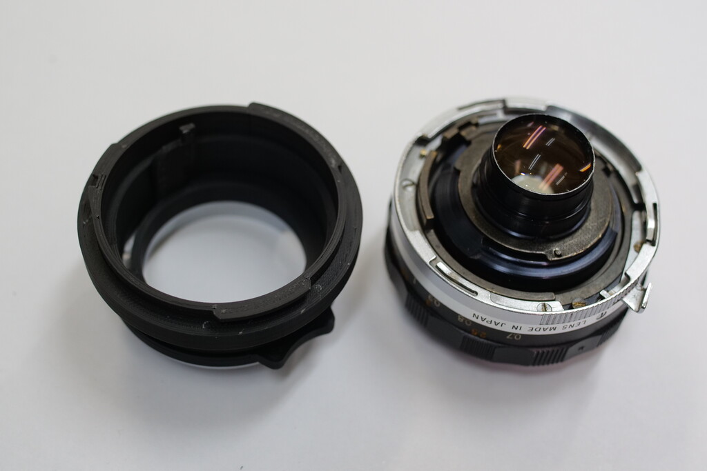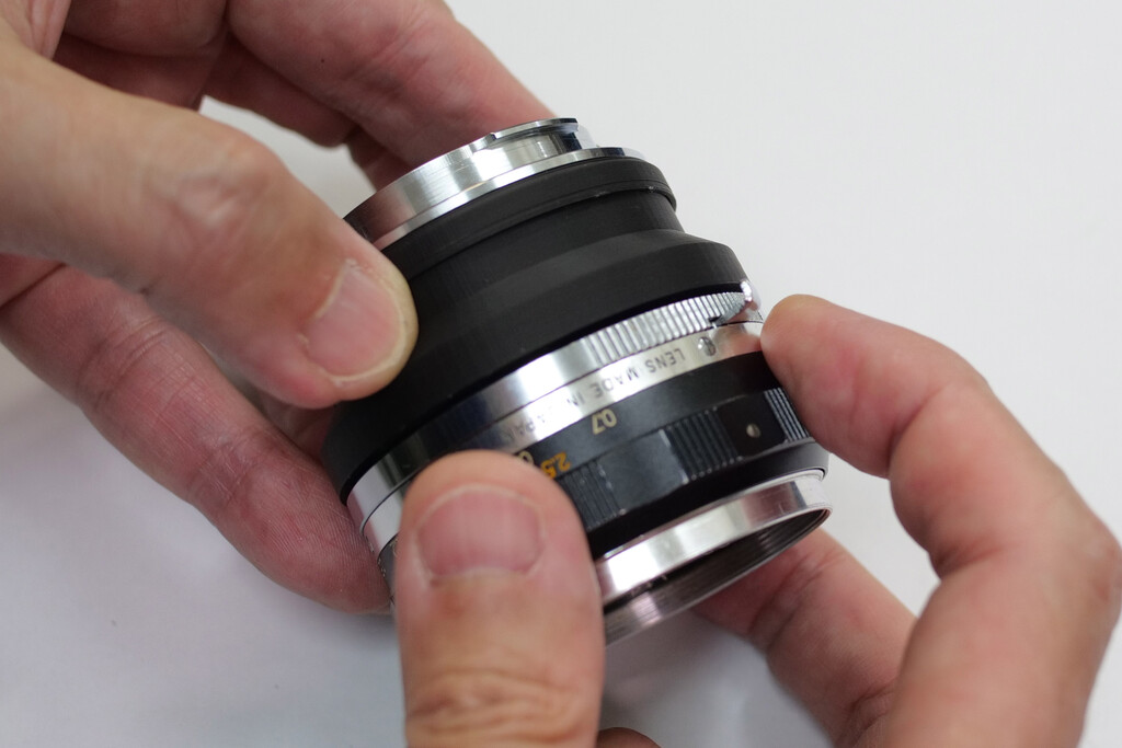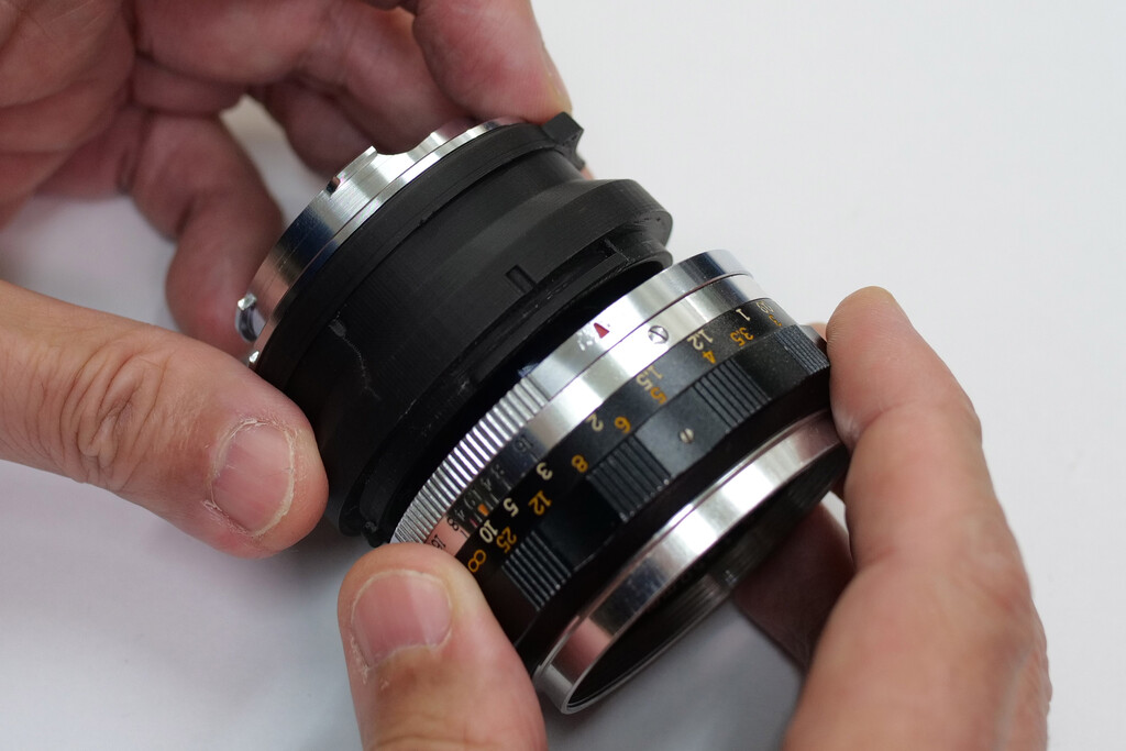 ベースのMマウント金属フランジで、絞りリングを後ろ側から組み込んで押さえるような構造にしました。