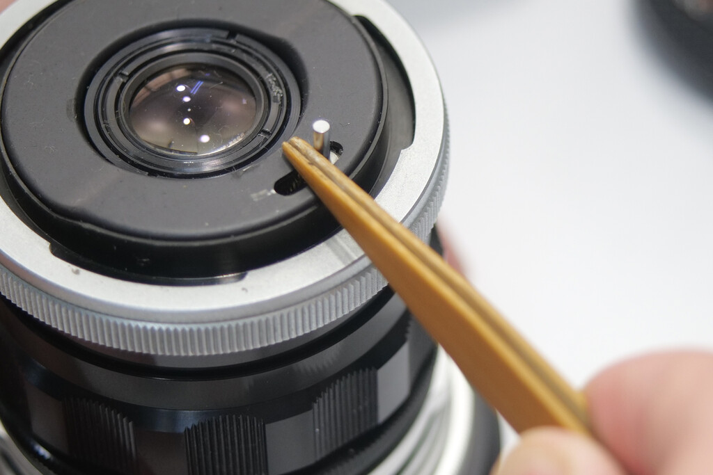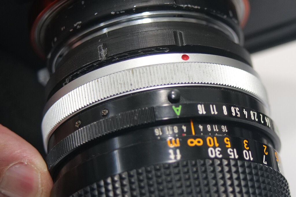 FD、FL、NFDレンズは絞りを動かすために、連動レバーを抑え込む必要があります。