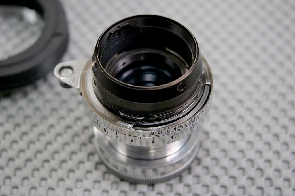 Focaのレンズはマウントから後ろに長くスカートになっており、ヘリコイドの直進キーが仕込まれてました。エルマーみたいに沈胴式ですが、レンズが回転するヘリコイドではなく、直進式のヘリコイドでした。