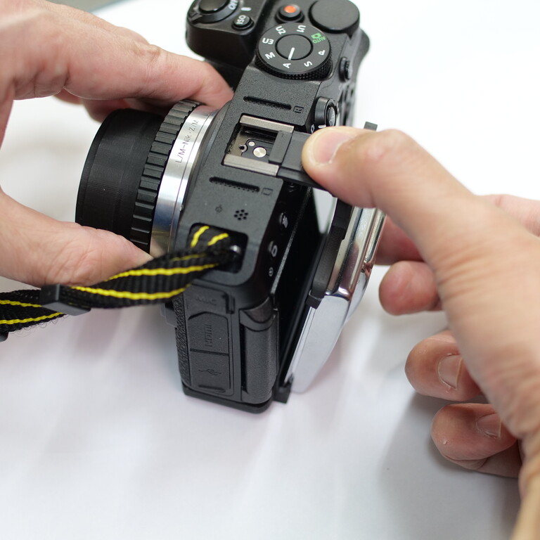 シグマfpは、動画機らしくネジ穴が左右にあったので、それを利用しましたが、Z30は、ネジは底面だけなので、底面のプレートに引っ掛けるようにファンダーフードを装着して、アクセサリシューで抑え込むようなイメージで作りました。これは、ライカMM246用に作ったときの応用です。